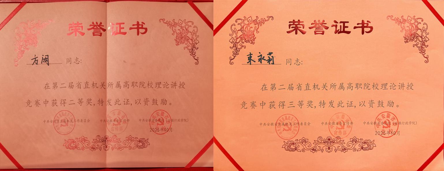 10月24日,由省委宣传部、省直机关工委、省委党校(安徽行政学院)联合举办的第二届省直机关所属高职院校理论讲授竞赛决赛在省直机关工委党校一楼报告厅圆满落幕。我院方闳、束永莉两位老师凭借出色表现,在比赛中脱颖而出,分获二等奖和三等奖,实现了我院在该项赛事中的历史性突破。